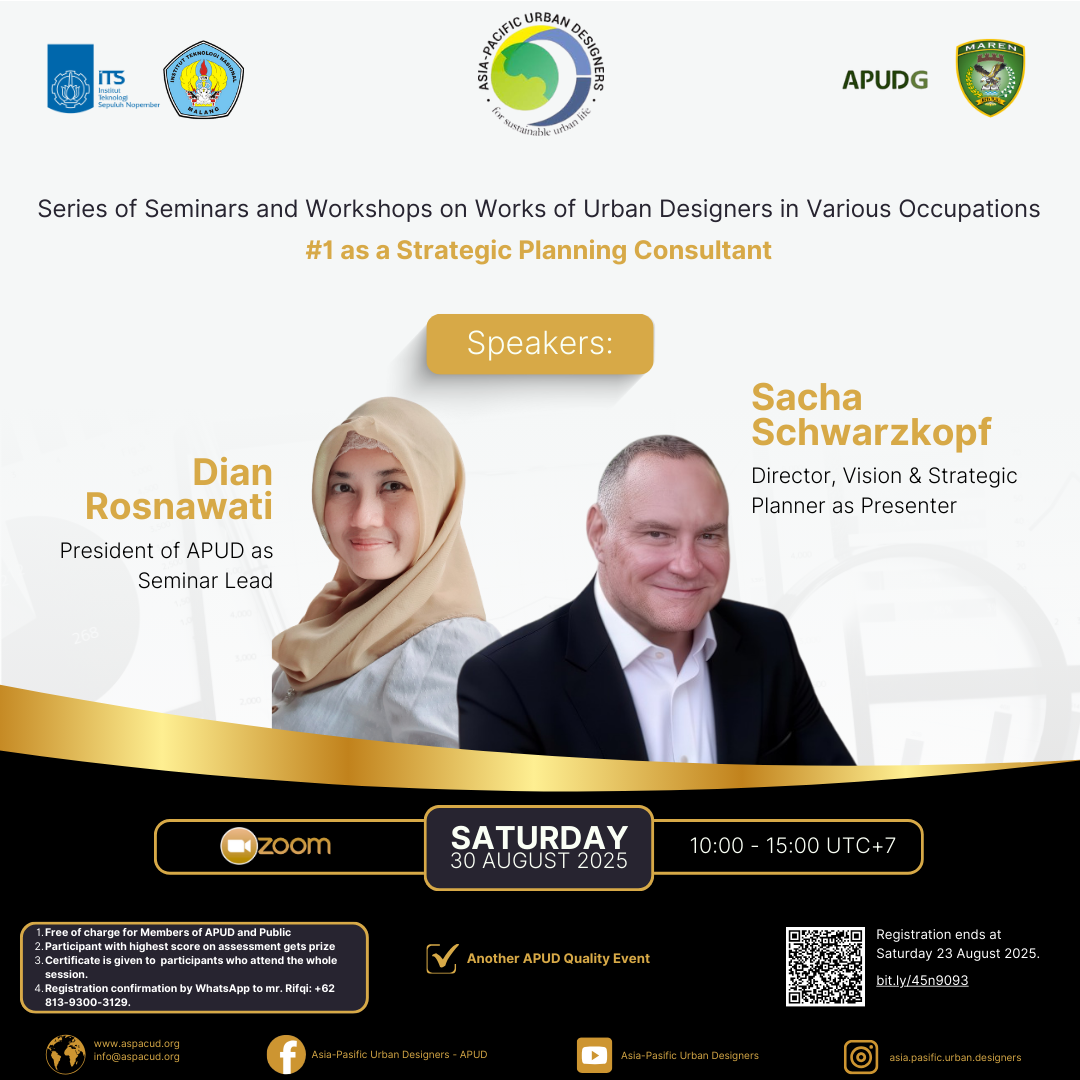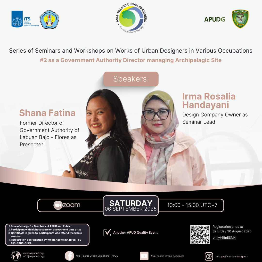 Keep updated by #following us on #Facebook Page, #instagram, and #Youtube, under the same name: Asia-Pacific Urban Designers (#APUD). To be invited in our #WhatsApp Group, contact mr. Ardiyanto: +6285233303445. Get more benefits as our member by registering on our website: aspacud.org/registration, or sending the required documents (listed on the website) to info@aspacud.org.