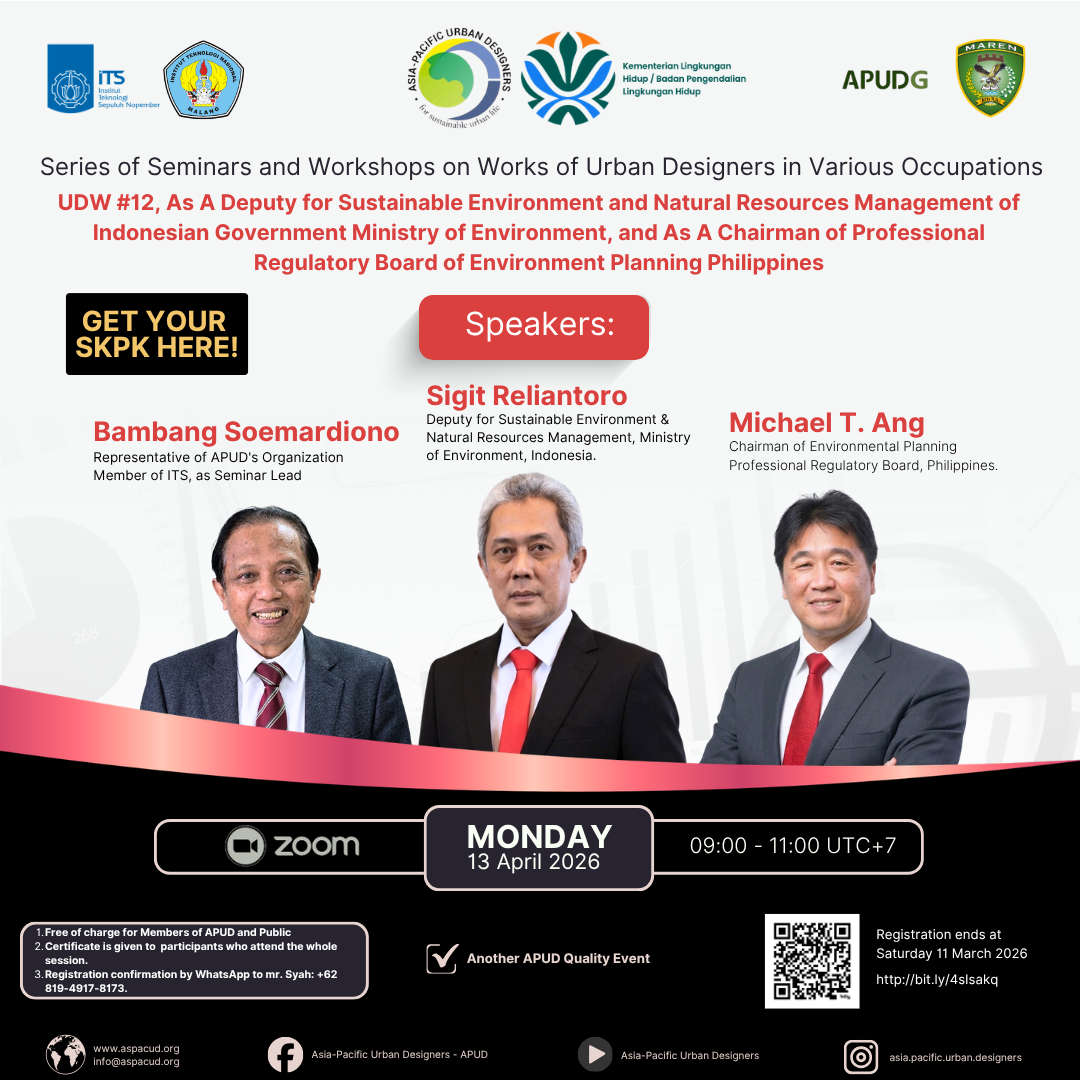 Keep updated by #following us on #Facebook Page, #instagram, and #Youtube, under the same name: Asia-Pacific Urban Designers (#APUD). To be invited in our #WhatsApp Group, please contact mr. Ardiyanto: +6285233303445. To get more benefits, be our member by registering on our website: www.aspacud.org/registration, or sending the required documents (listed on the website) to info@aspacud.org.
